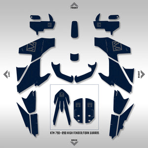 In The Box: Includes graphics for the headlight bezel/fairing, side panels (F & R), fork guards, front fender (high & low) and the swingarm. **This kit does include pieces for the 890 front fender and fork guards for those using those parts for a high fender.