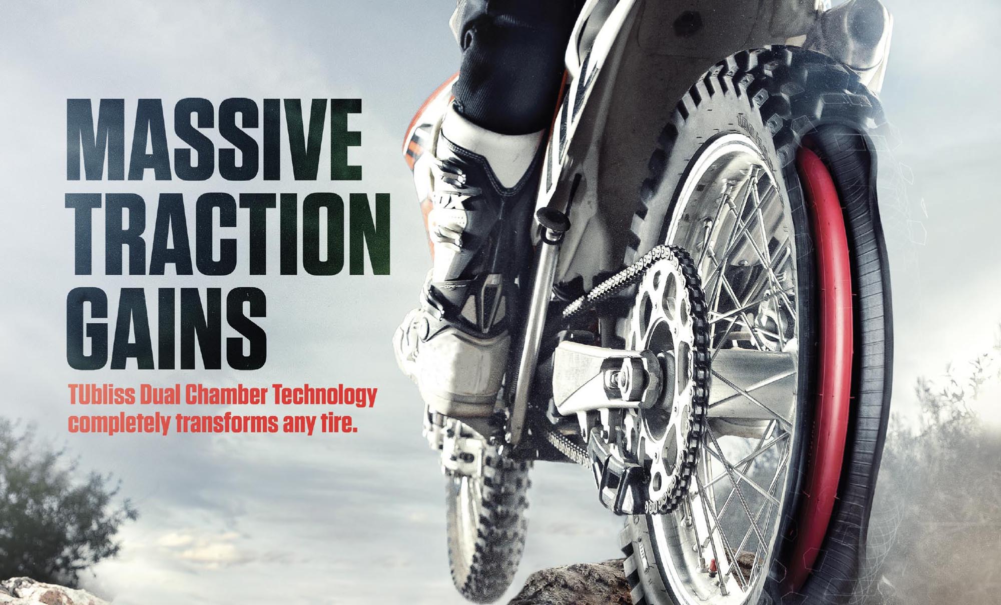 TUbliss replaces conventional inner tubes with a small red 100 psi insert that creates two different pressure zones inside the tire itself. This enables an incredible 100 PSI of rim protection, increased tire stability and eliminates pinch flats. In turn, this allows you to run very low tire pressure for massive gains in traction and a much plusher ride.